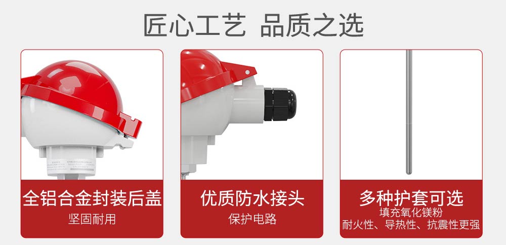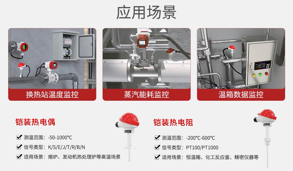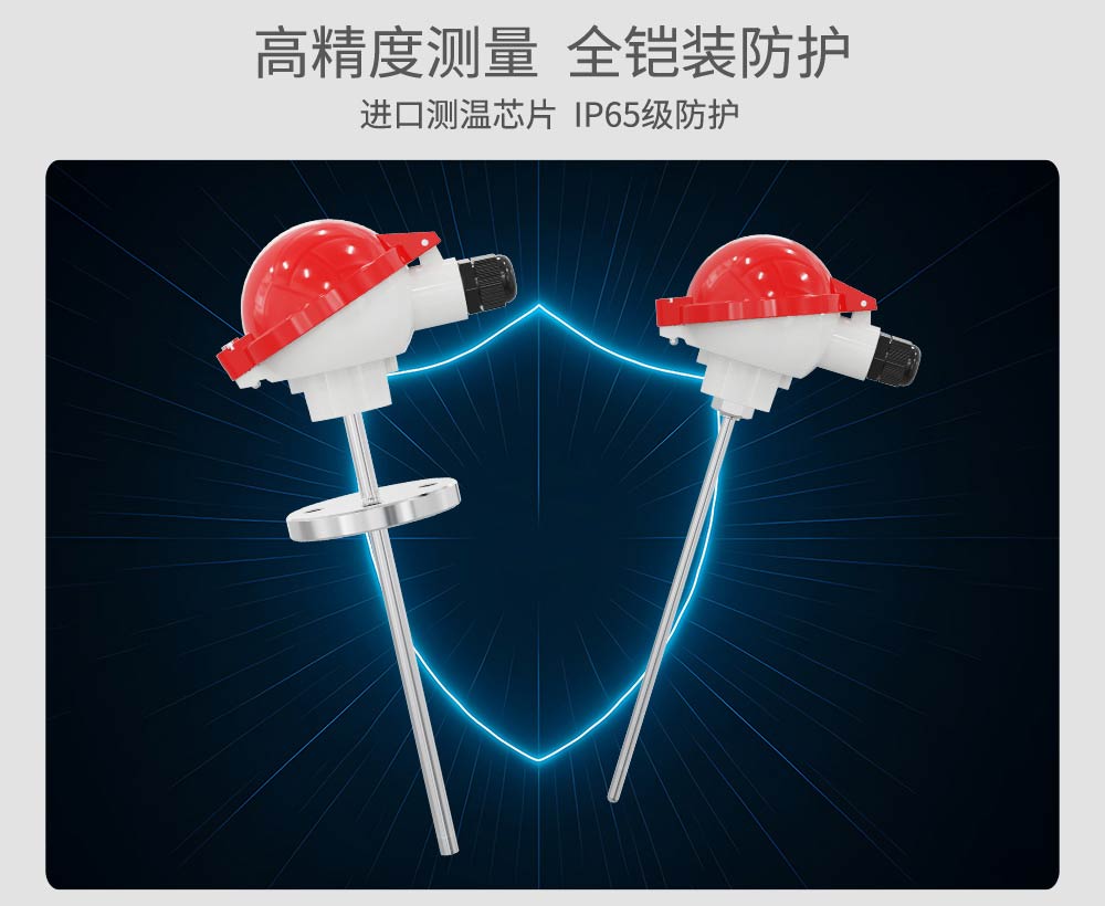 铠装热电阻温度传感器全部采用的进口芯体,采用不锈钢外壳,从而达到稳定性好,精度高,抗震性能强等特点。目前市场上热电阻主要是Pt100,热电偶主要是K型、T型、S型、R型、B型、N型、E型、J型等8种常规型号,具体现场需要热电阻还是热电偶,主要根据现场测温精度与测温范围确定。 铠装温度传感器可以测量液体、蒸汽和气体介质以及固体表面温度,广泛应用于工业自动化设备配套及石油、化工、冶金、电力等过程控制领域。