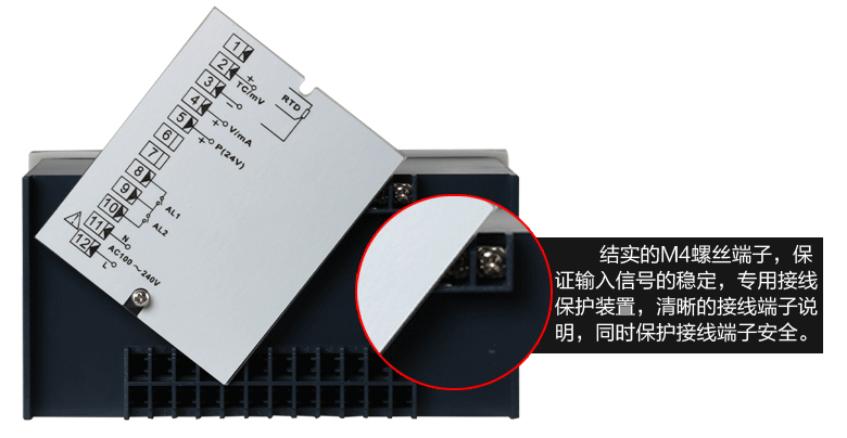 3、结实的M4螺丝端子,保证输入信号的稳定,专用接线保护装置,清晰的接线端子说明,同时保护接线端子 安全。