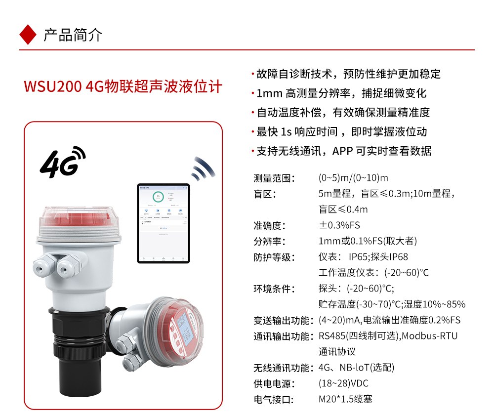 美控WSU-200 4G物联超声波液位计具有高可靠性、高性价比、易安装维护的液位/物位测量仪器,可广泛用于各种液体和固体物料高度的测量。本产品可选配 NB-IoT 无线通讯功能,用户可在仪表云平台进行数据查看和远程监控。常见的应用工况,如市政、化工、储运等工业环境中的河流、水池、储罐等液位测量。咨询热线:400-152-1718